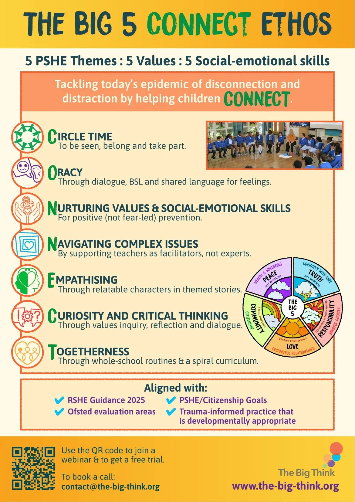 The BIG 5 is a Primary PSHE and RSHE programme for 5–11-year-olds delivered through a whole-school, SAFE spiral curriculum (underpinned by the EEF SAFE Framework for Social and Emotional learning) of values-based Assemblies and/or Lessons that link closely with your own school values.