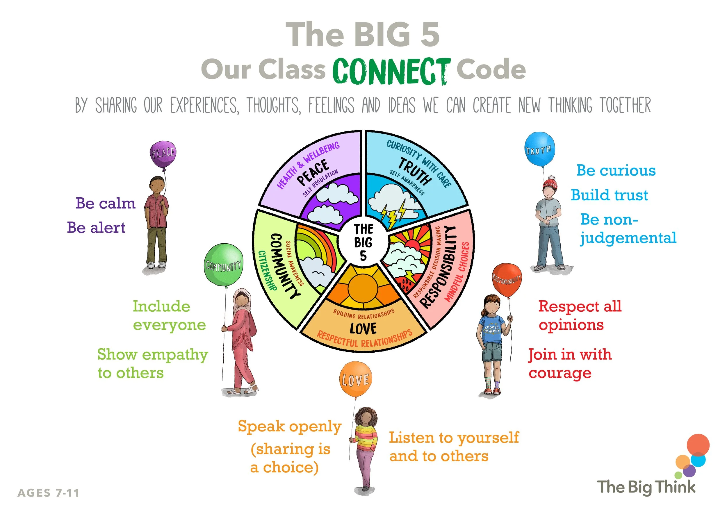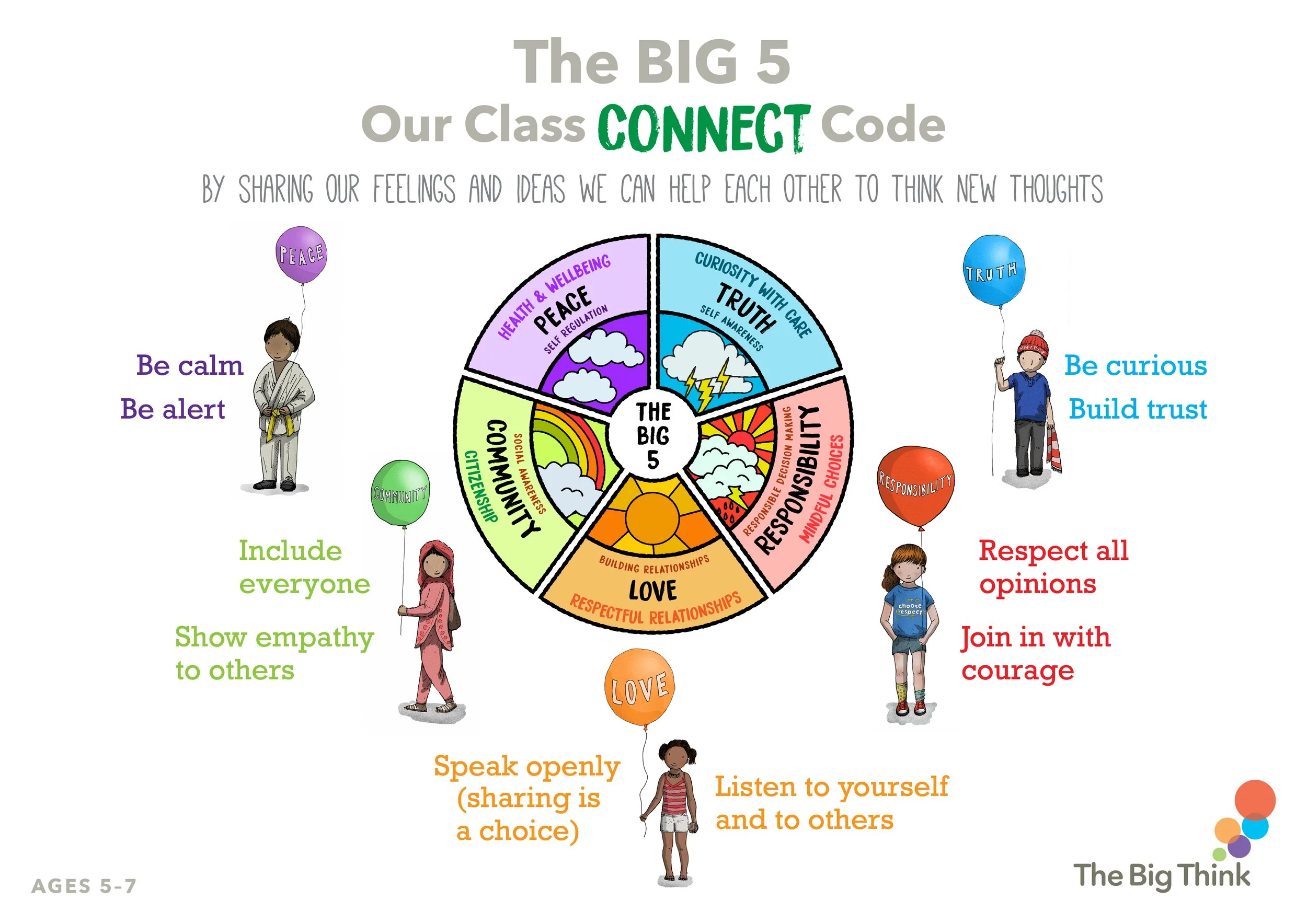 There are 5 Songs based on our 5 core values, written and performed by The BIG Thinkers band and suitable for all ages. Add actions or sign language, or your own school chant to the musical interludes.